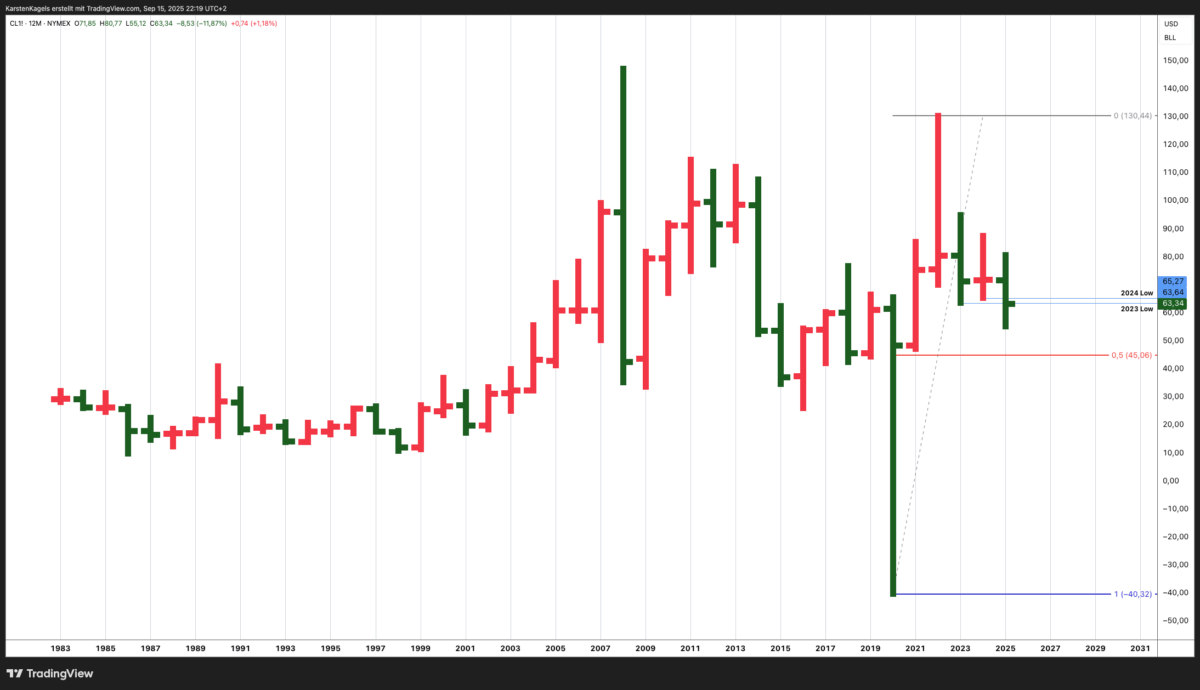 The provided chart displays the long-term price action of Light Crude Oil futures (WTI) from 1983 to 2025, showing historical price movements and potential future projections.